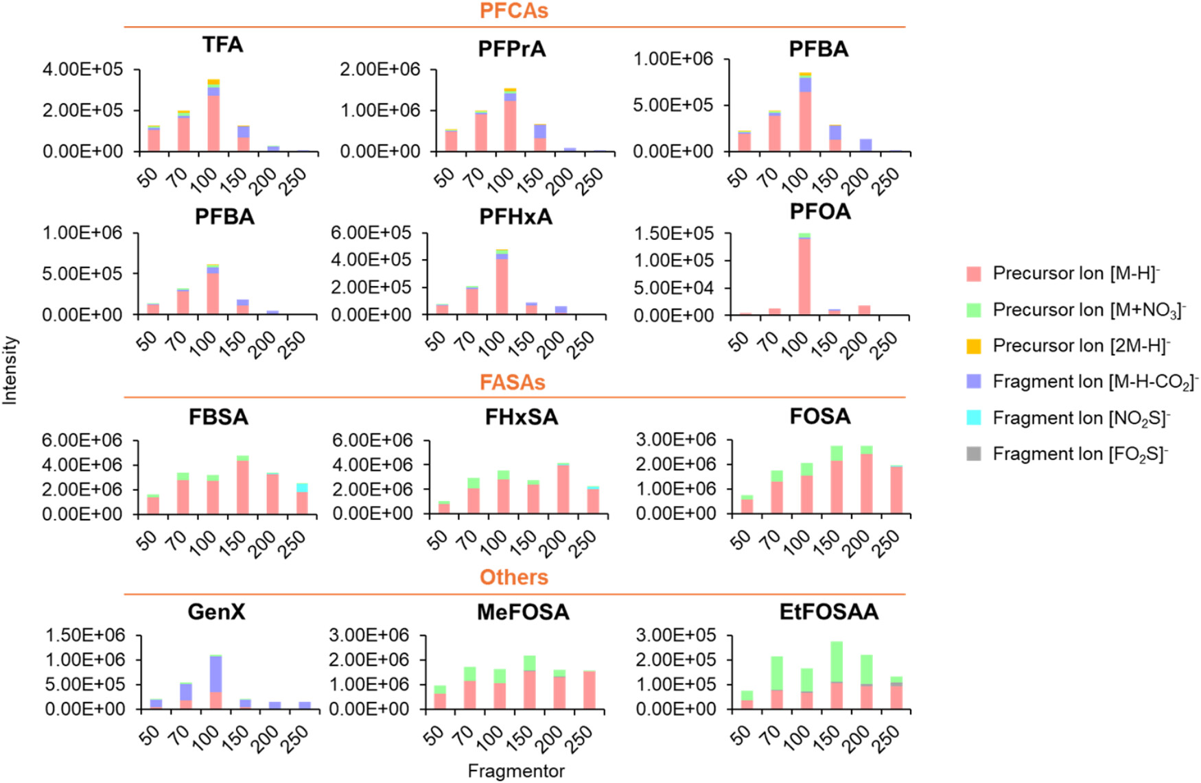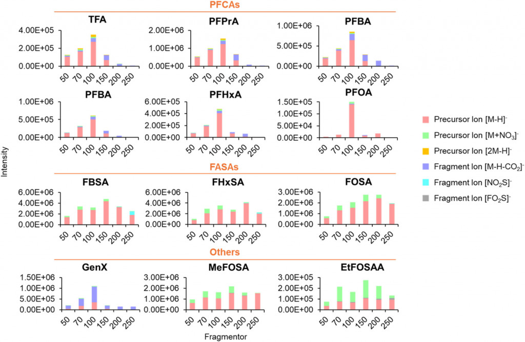 Ionization profiles of PFAS of different subclasses (PFCAs, FASAs, and others). Precursor and fragment ion distributions were derived from high-resolution mass spectra acquired in negative ion mode, with fragmentor voltages optimized between 50 and 250 V. [1]