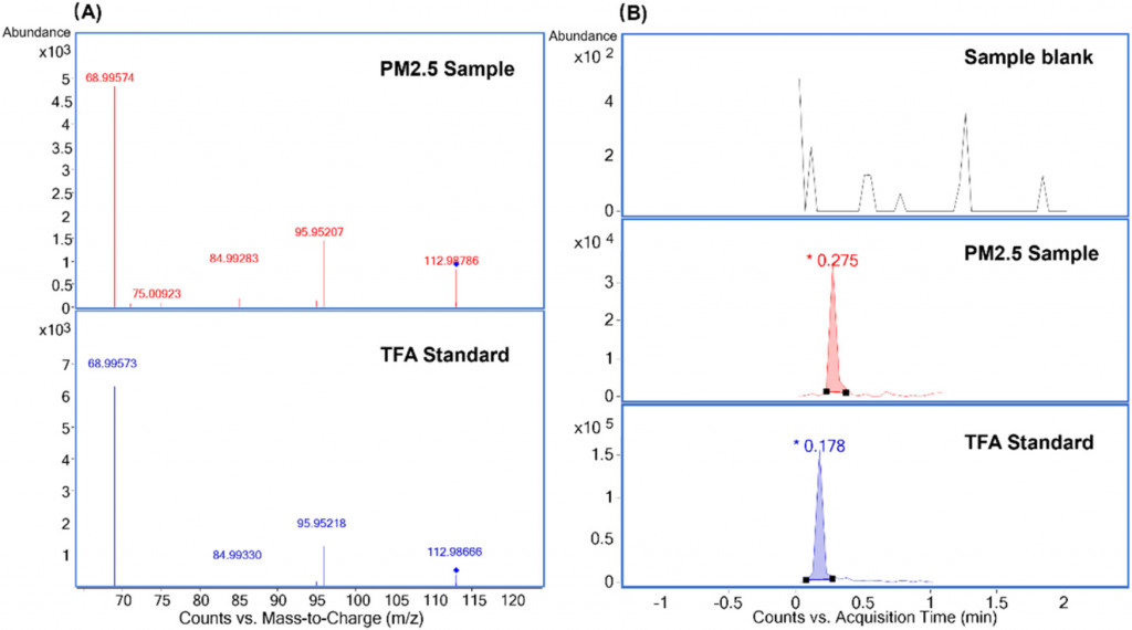 MS/MS spectrum of TFA detected in a PM2.5 sample and chemical standard spiked on blank sample (A) and EICs for TFA with the transition m/z 113 → 69 from a blank sample, a representative PM2.5 sample, and the chemical standard (B). Due to the manual injection approach, the retention time may vary among samples, whereas it will not influence the identification of targeted analytes. [1]